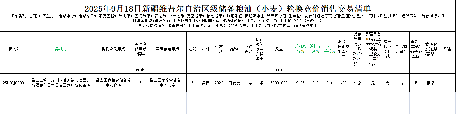 2025年9月18日新疆维吾尔自治区级储备粮油(小麦)轮换竞价销售交易清单