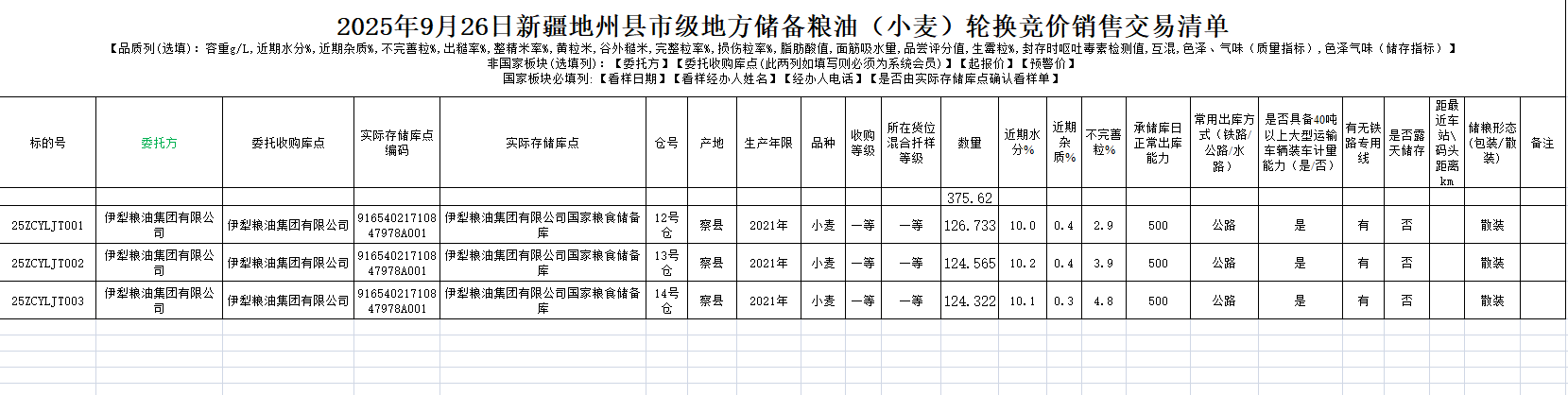 2025年9月26日新疆地州县市级地方储备粮油(小麦)轮换竞价销售交易清单