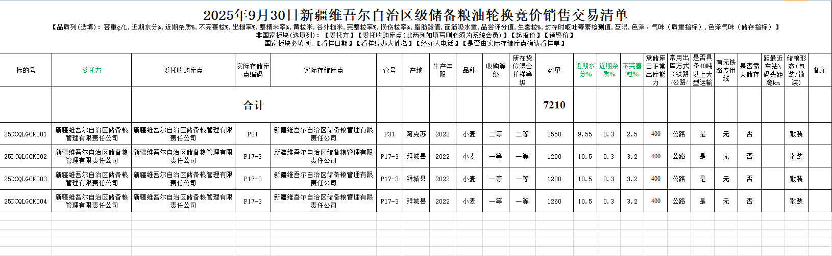 2025年9月30日新疆维吾尔自治区级储备粮油轮换竞价销售交易清单