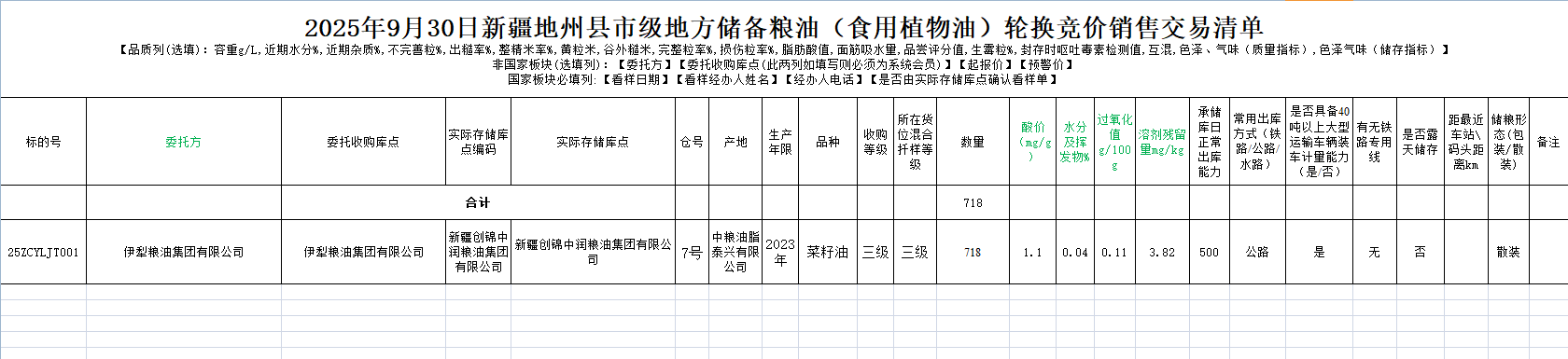 2025年9月30日新疆地州县市级地方储备粮油(食用植物油)轮换竞价销售交易公告(第37-3场)