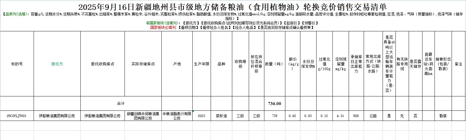 2025年9月16日新疆地州县市级地方储备粮油(食用植物油)轮换竞价销售交易清单