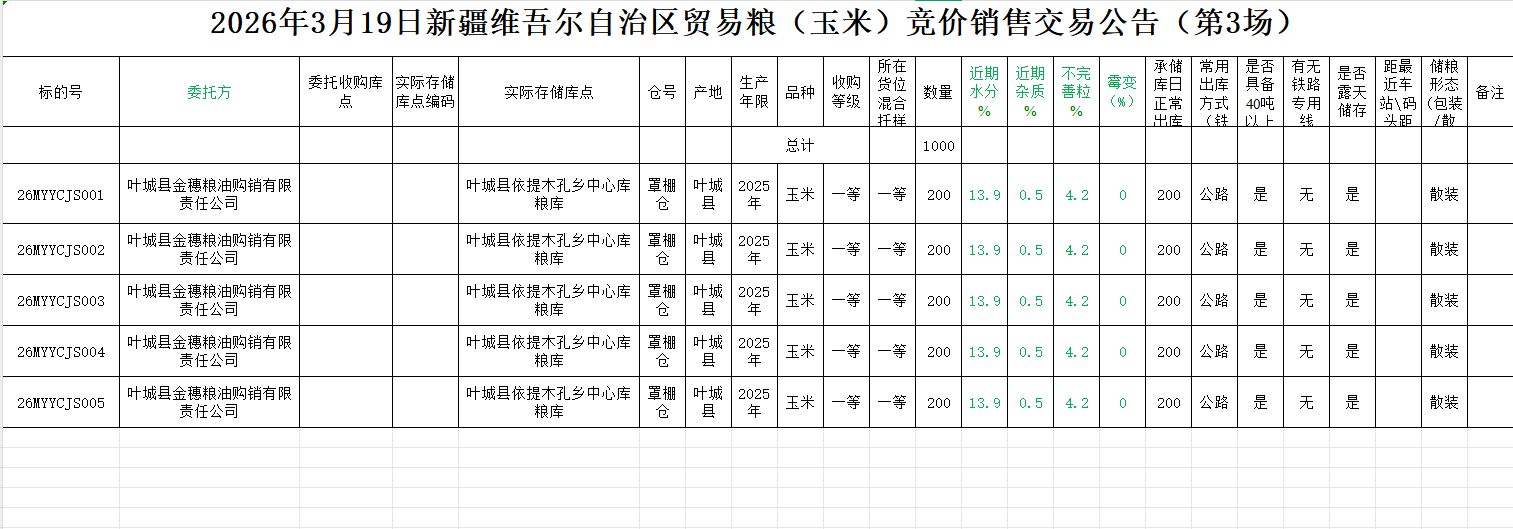 2026年3月19日新疆维吾尔自治区贸易粮(玉米)竞价销售交易清单(第3场)