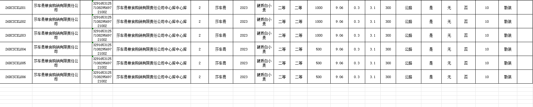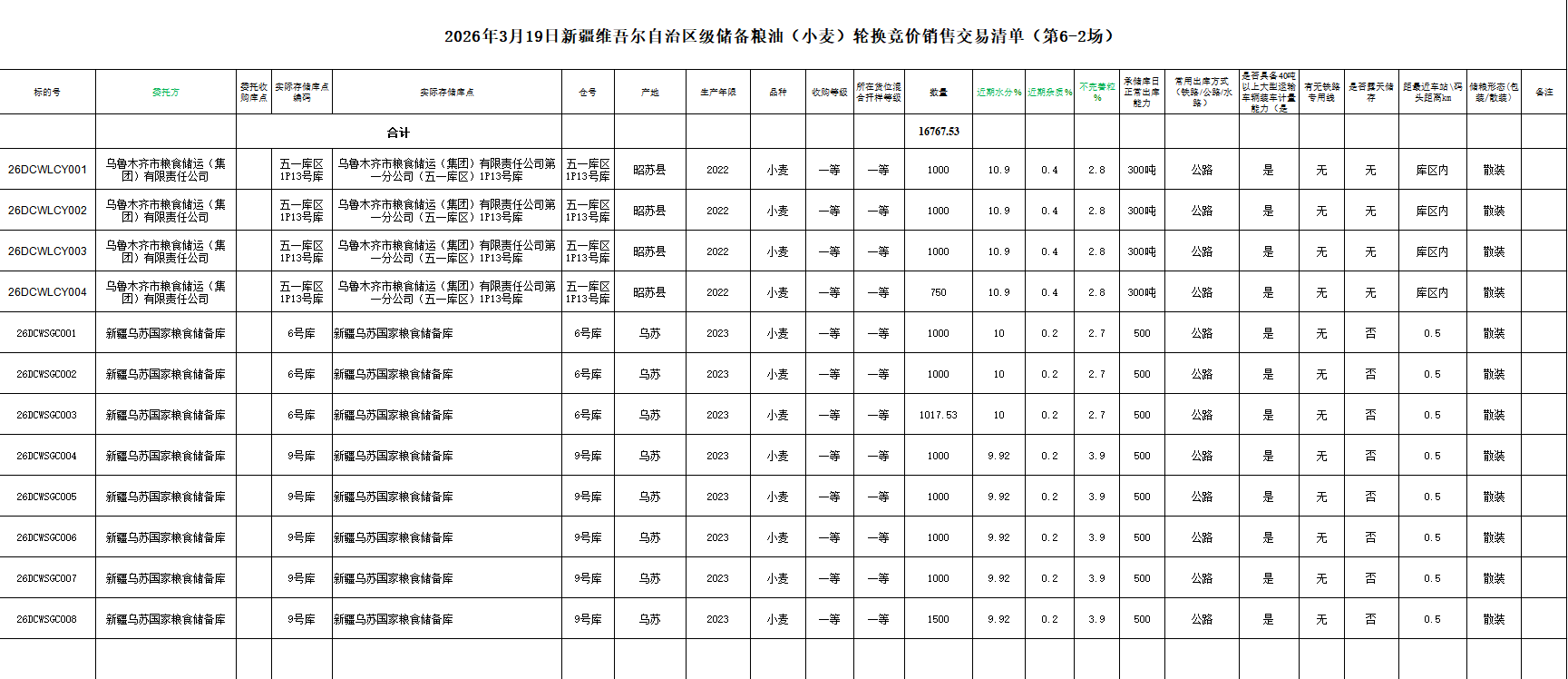 2026年3月19日新疆维吾尔自治区级储备粮油(小麦)轮换竞价销售交易清单(第6-2场)
