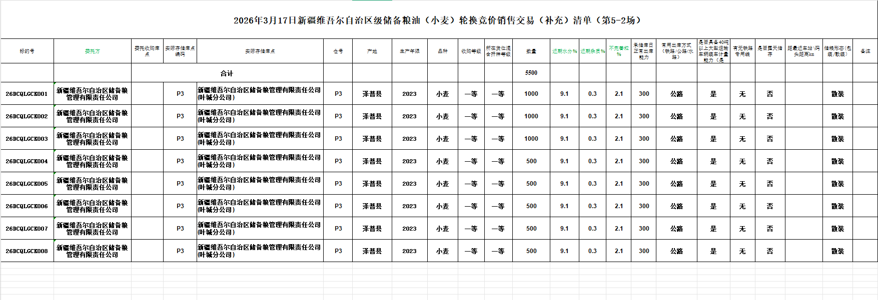 2026年3月17日新疆维吾尔自治区级储备粮油轮换竞价销售交易(补充)清单(管理公司)