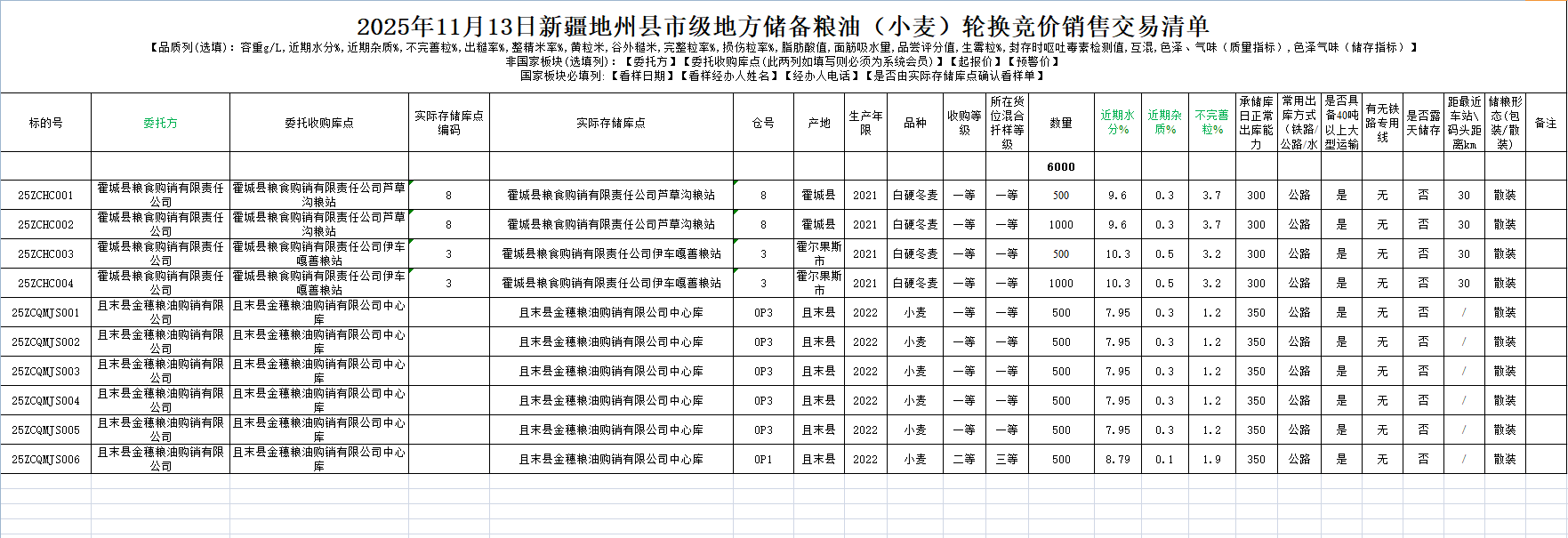 2025年11月13日新疆地州县市级地方储备粮油(小麦)轮换竞价销售交易清单