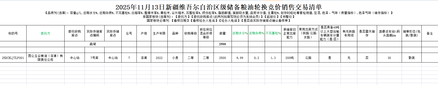 2025年11月13日新疆维吾尔自治区级储备粮油轮换竞价销售交易清单
