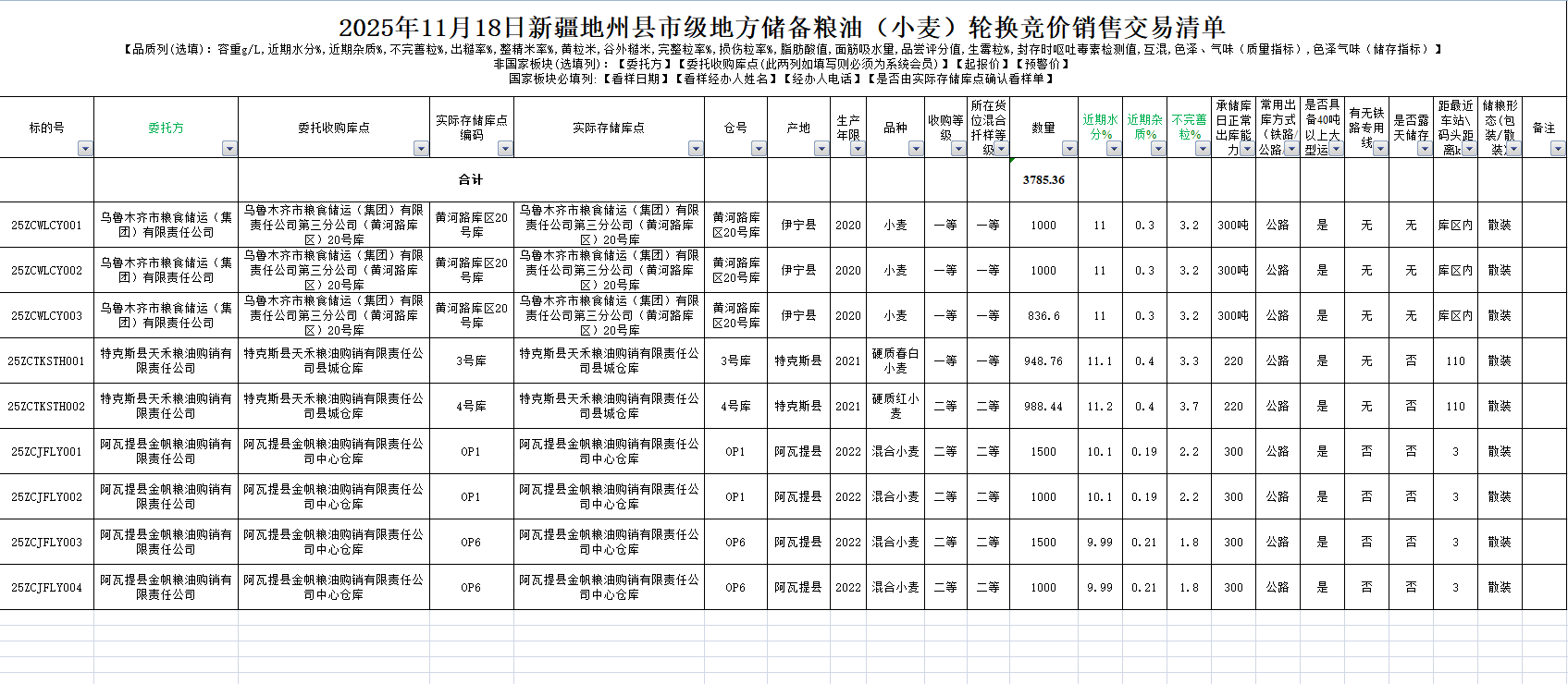 2025年11月18日新疆地州县市级地方储备粮油(小麦)轮换竞价销售交易清单