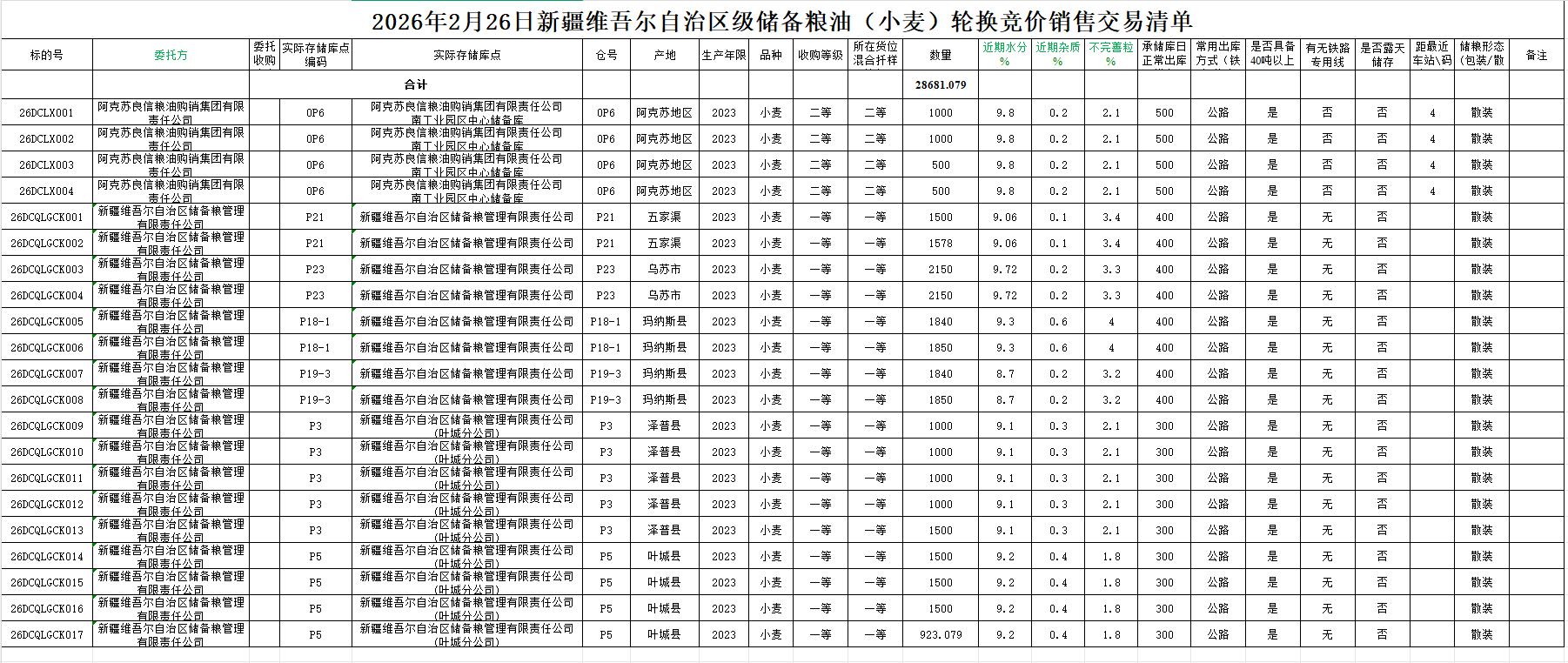 2026年2月26日新疆维吾尔自治区级储备粮油(小麦)轮换竞价销售交易清单(第1-2场)