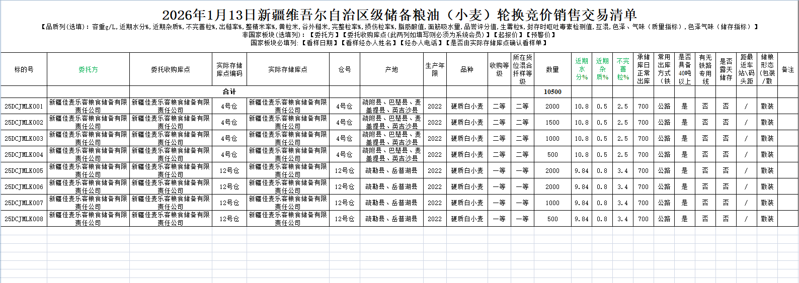 2026年1月13日新疆维吾尔自治区级储备粮油(小麦)轮换竞价销售交易清单