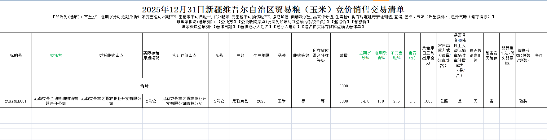 2025年12月31日新疆维吾尔自治区贸易粮(玉米)竞价销售交易清单