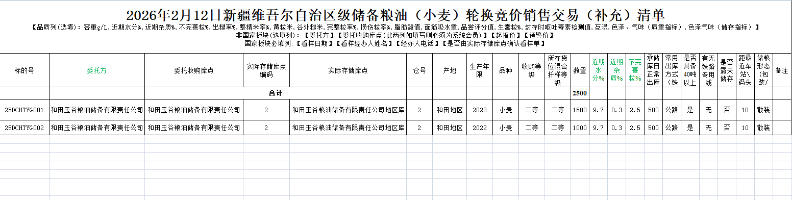 2026年2月12日新疆维吾尔自治区级储备粮油(小麦)轮换竞价销售交易(补充)清单